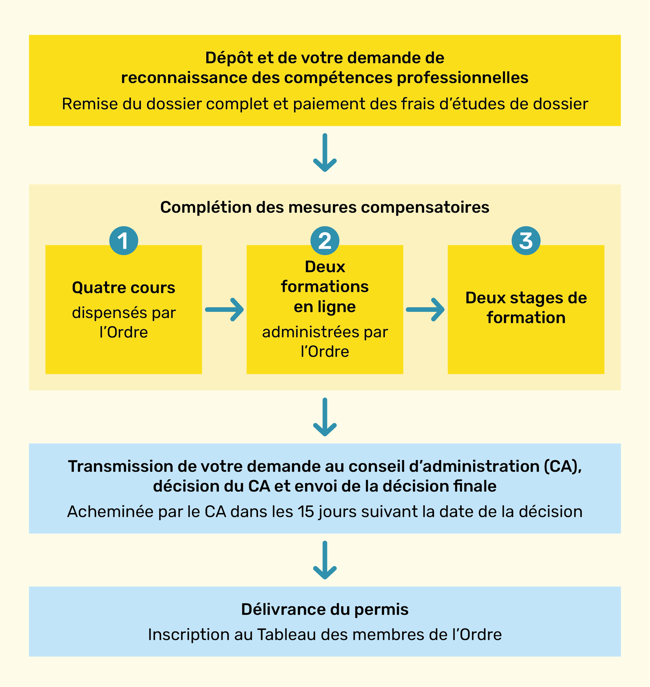 Lorsque toutes les mesures compensatoires seront complétées et les frais d’étude de dossier acquittés via le Portail OOAQ, la demande de reconnaissance des compétences professionnelles sera transmise au conseil d’administration (CA) qui rendra sa décision.